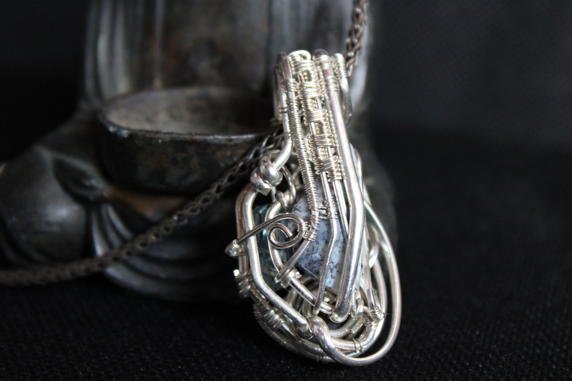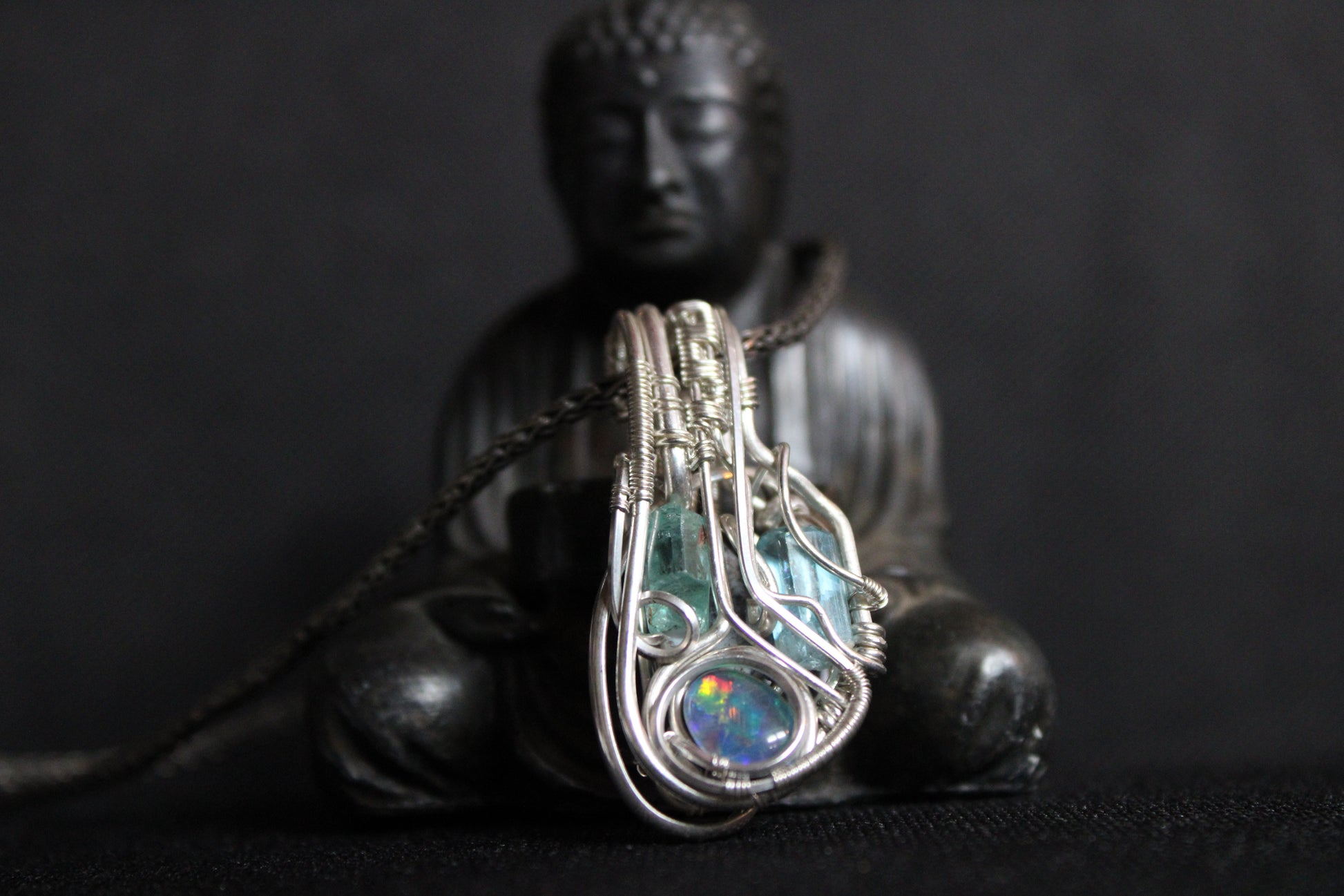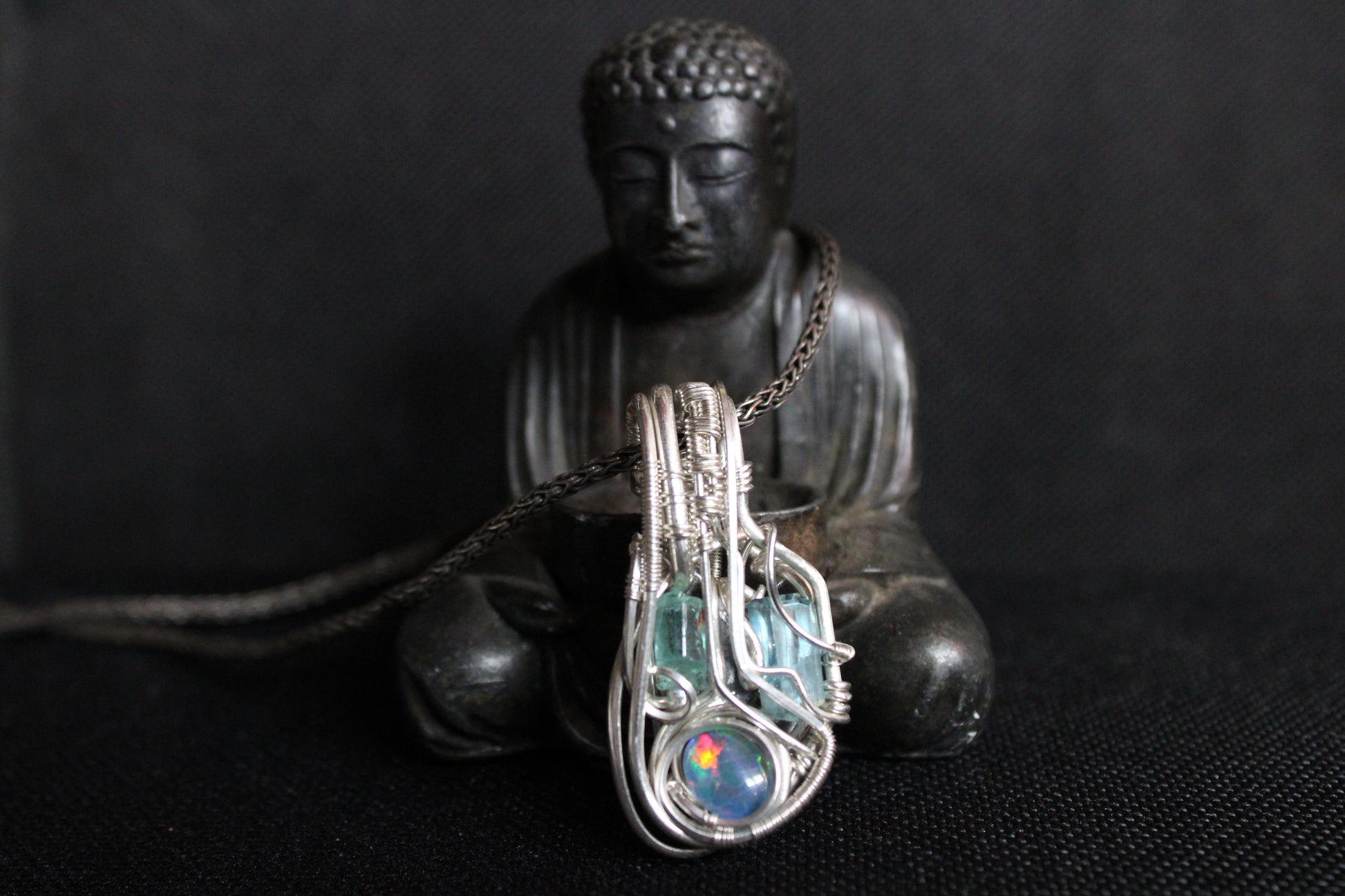 Featuring super clear aquamarine and vanadium alongside a very flashy opal triplet, this sterling silver pendant is one of the most ice inspired pieces in my collection. Hidden in the back, for those times the pendant flips, I added in a nice little lace agate cabachon.