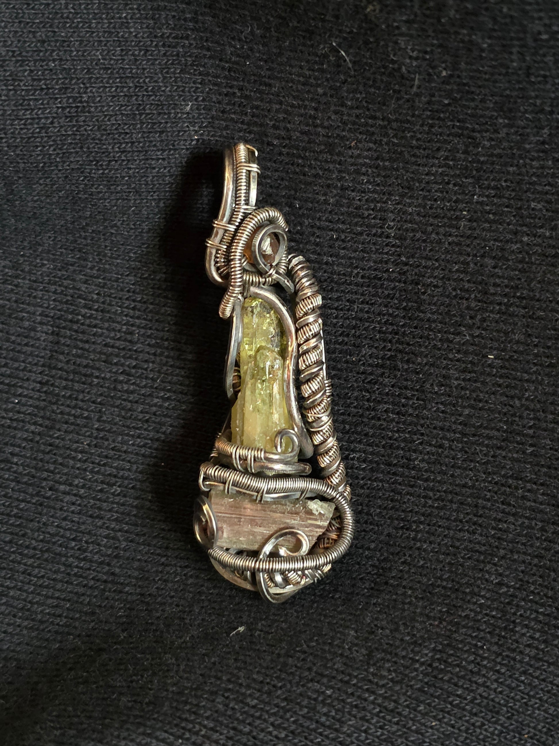 Talk about your funky freestyles! Featuring some super tight details, this wire wrap houses a juicy vesuvianite, watermelon tourmaline, and spessartine garnet. That tight spiral on the side uses 32g fine silver, about as fine as the hair on your head (assuming you have hair).