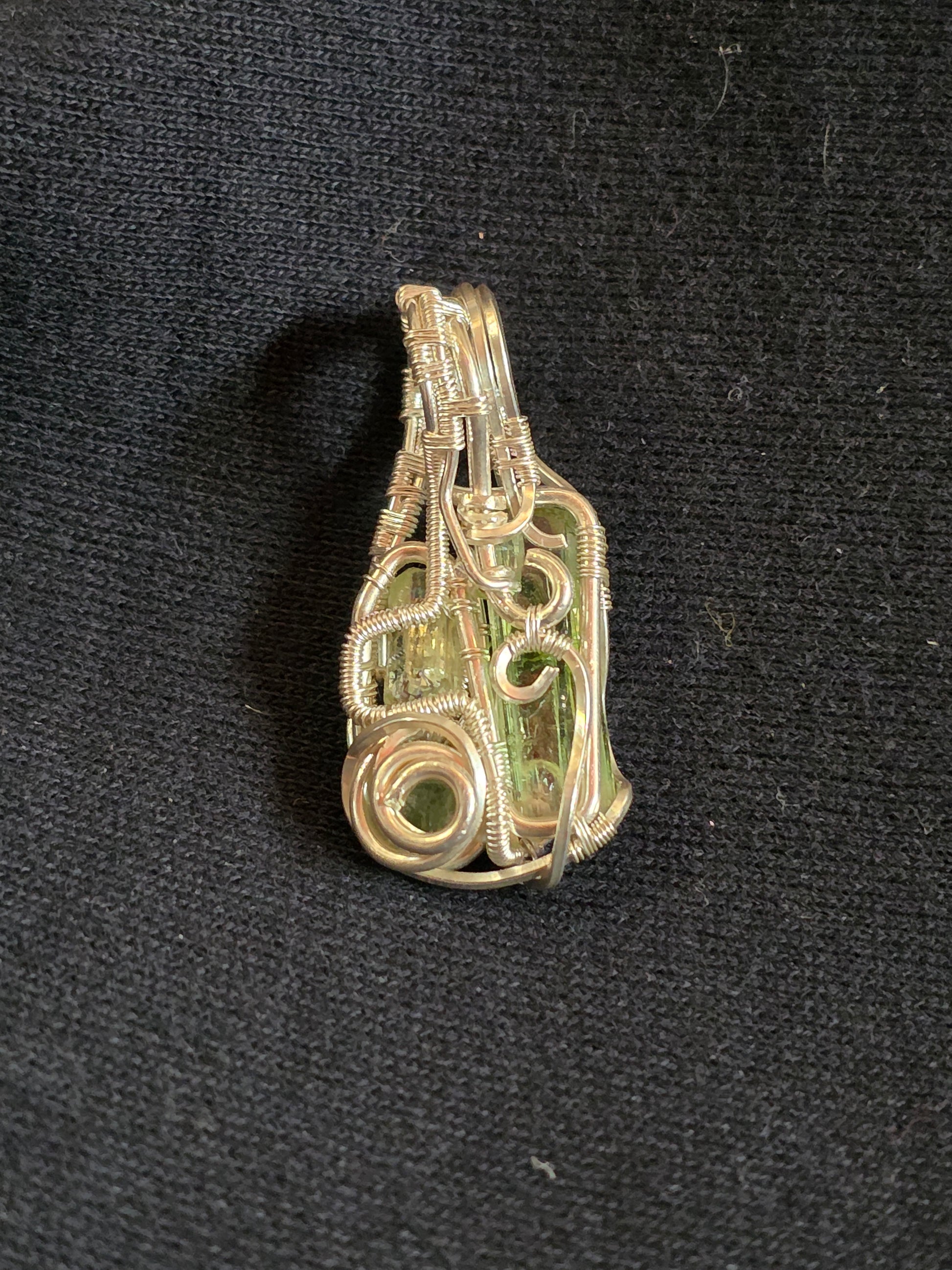 Designed with assistance from my muse while envisioning the home of the Alfar, the realm of the Norse elven folk, I offer: Hope of the Alfar. Flowy and delicate in form, yet sturdy in construction, this lovely pendant channels the spirit of the Alfar here on our plane of Midgard. Possessing the crystalline energies of Diopside and two green tourmalines, this talisman is sure to root you in nature. Wrapped in sterling silver.