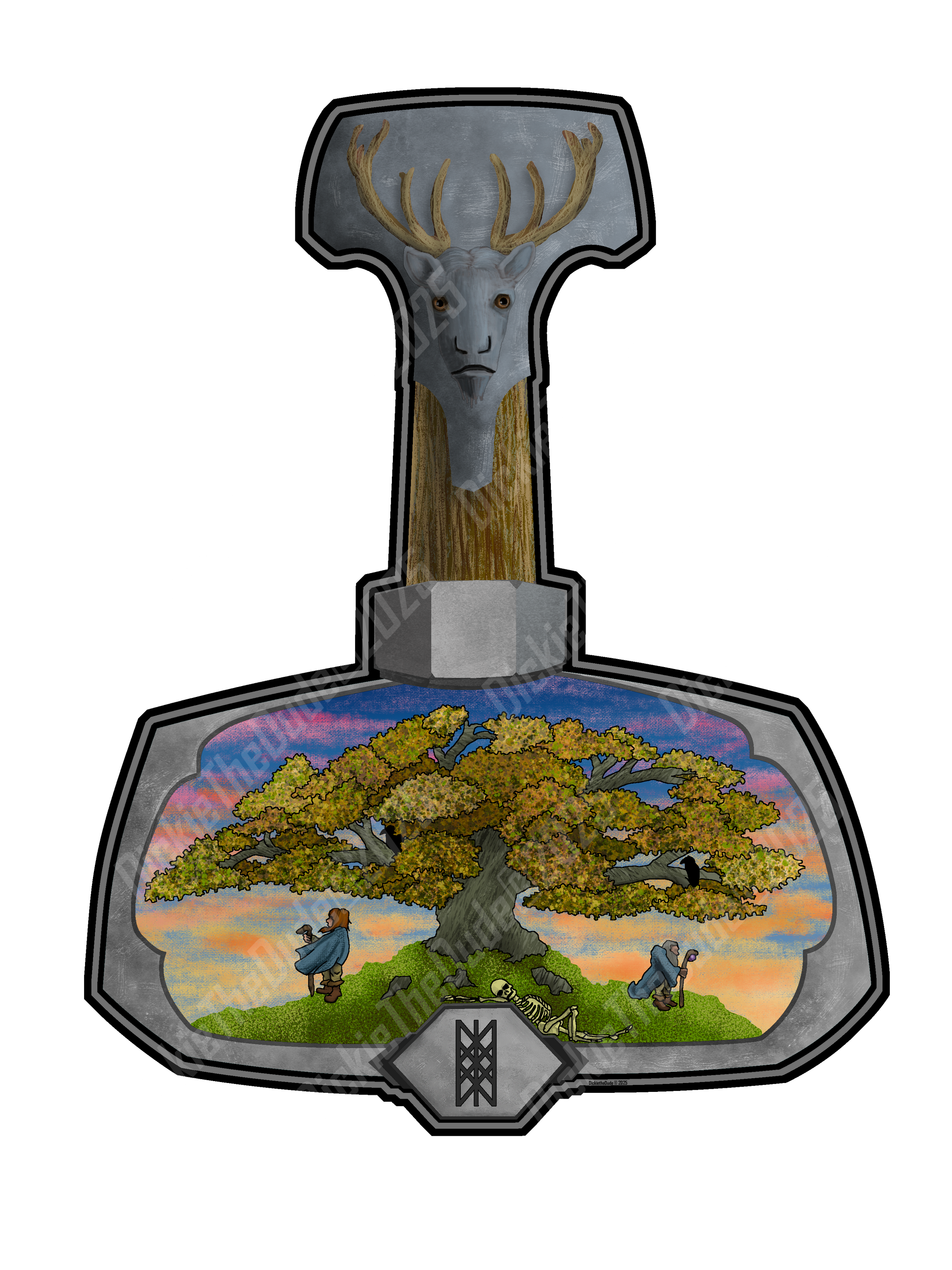 Mjolnir, forged by dwarven brothers Brokk and Sindre, the legendary hammer was wielded by Thor, god of thunder. In this depiction, I illustrate the journey of the warrior, from the young and brave wanderer, to the wise and crippled sage, and finally to bones once again feeding the great tree, Yggdrasil. Watching this young man's journey are the raven's Huginn and Muninn, perched in the limbs of the old ash tree, guarding thought and spurring memory.