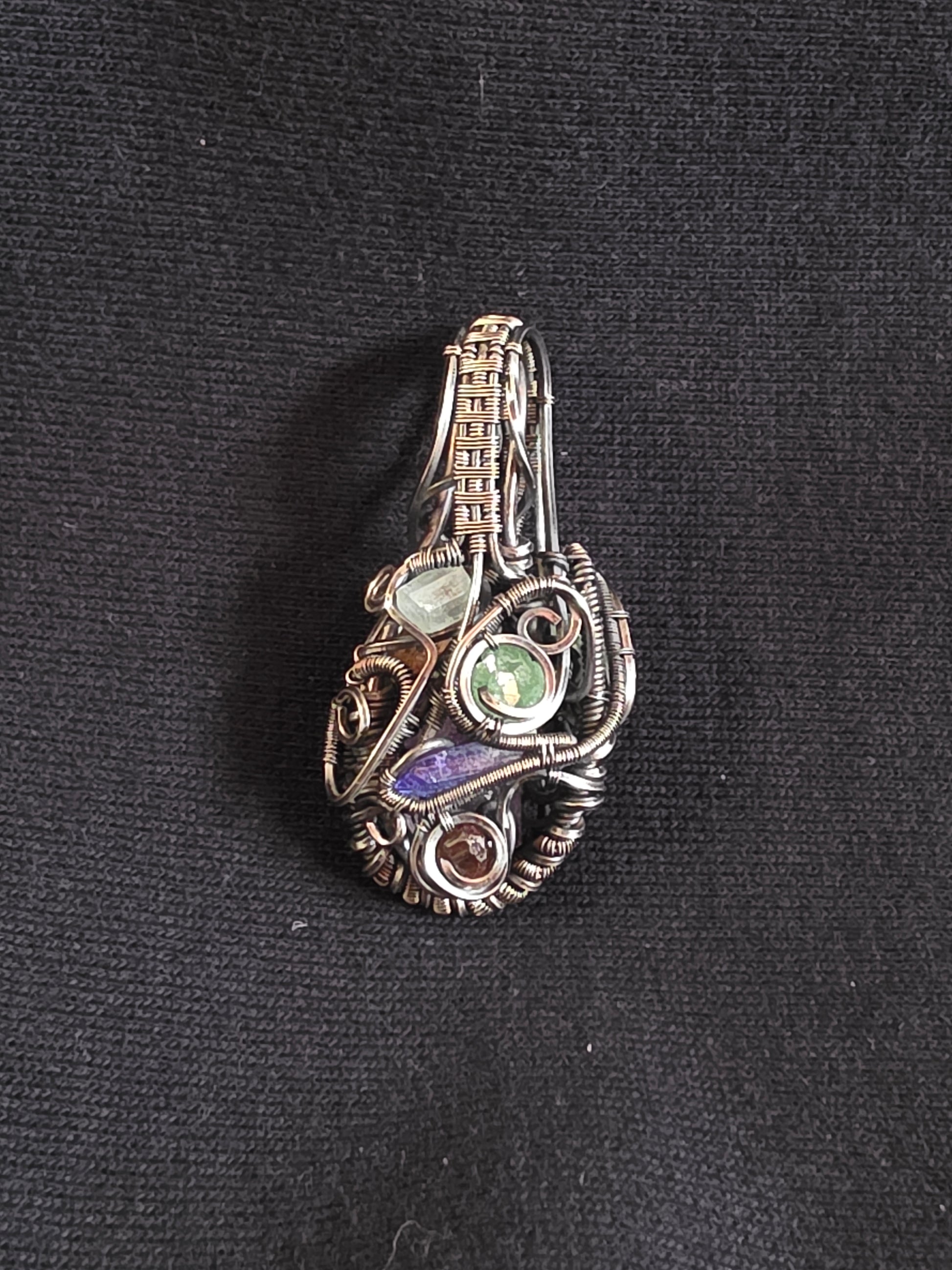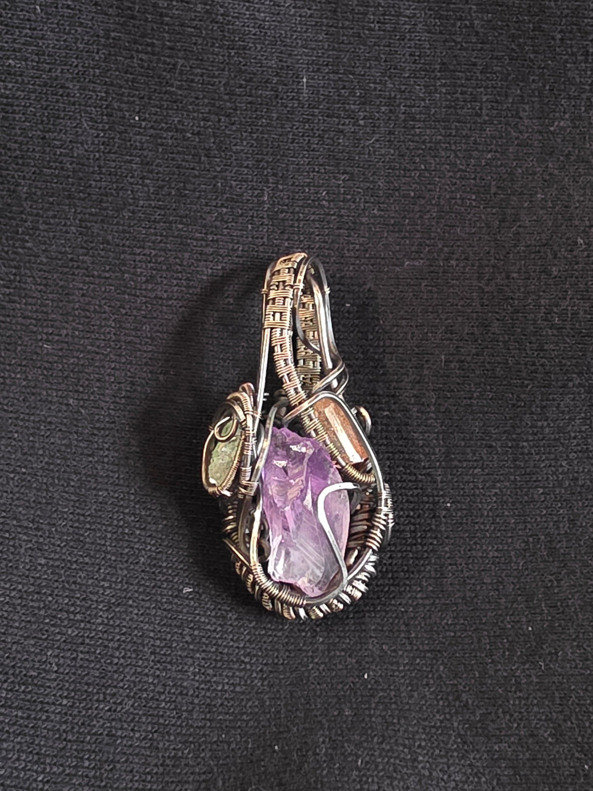 Designed to be worn in either direction, Soul Weave offers two distinct aesthetics while offering the full energy of the talisman's crystals. On one side, a complex of crystals: Tsavorite, Spessartine, Tanzanite, and Aquamarine offer detail and depth. On the opposite side: Amethyst, Tsavorite, and Imperial Topaz present a more calming and open approach. Only sterling silver was used in the wrapping of this talisman, which was then oxidized and polished for a beautiful patina.