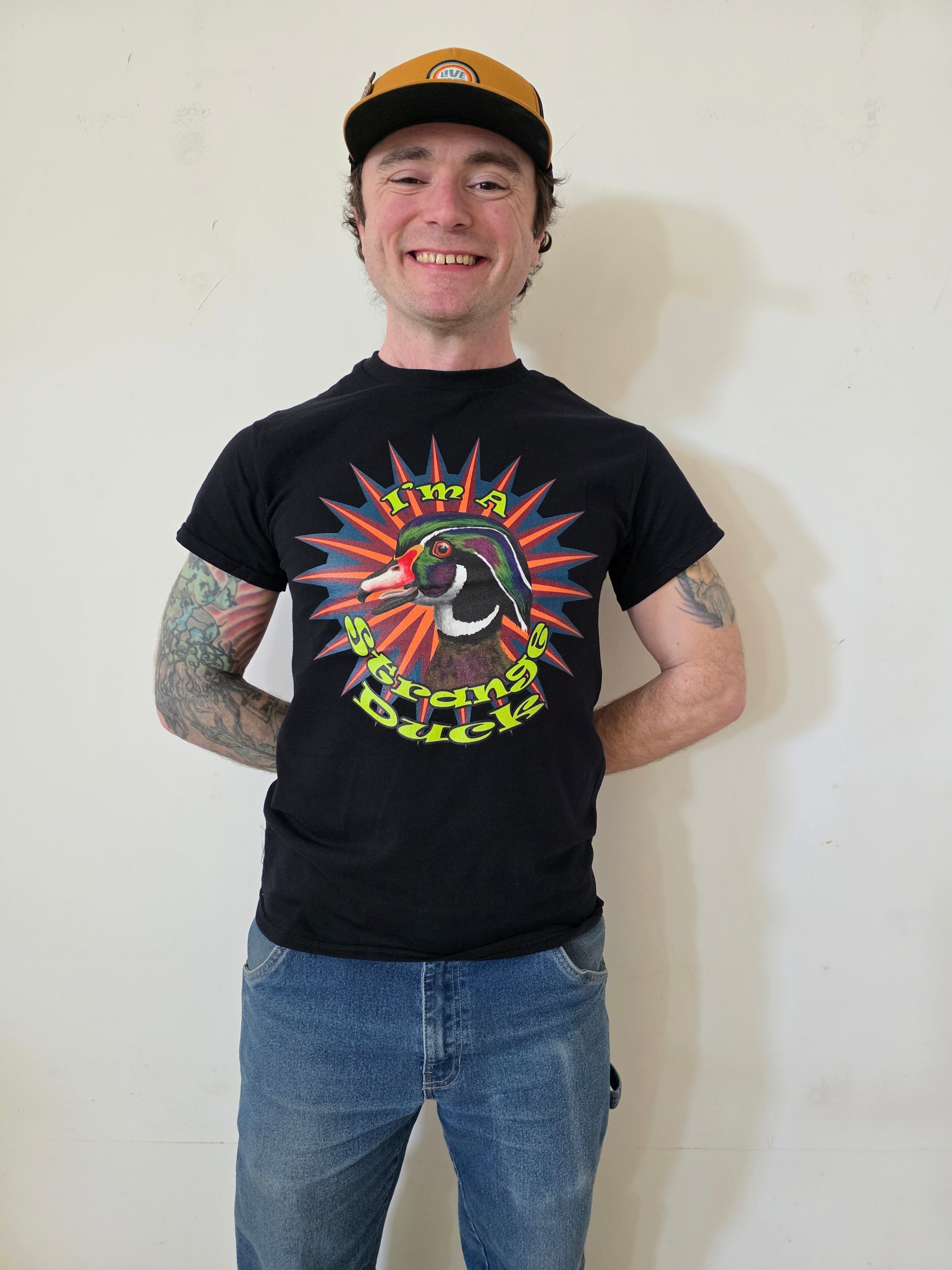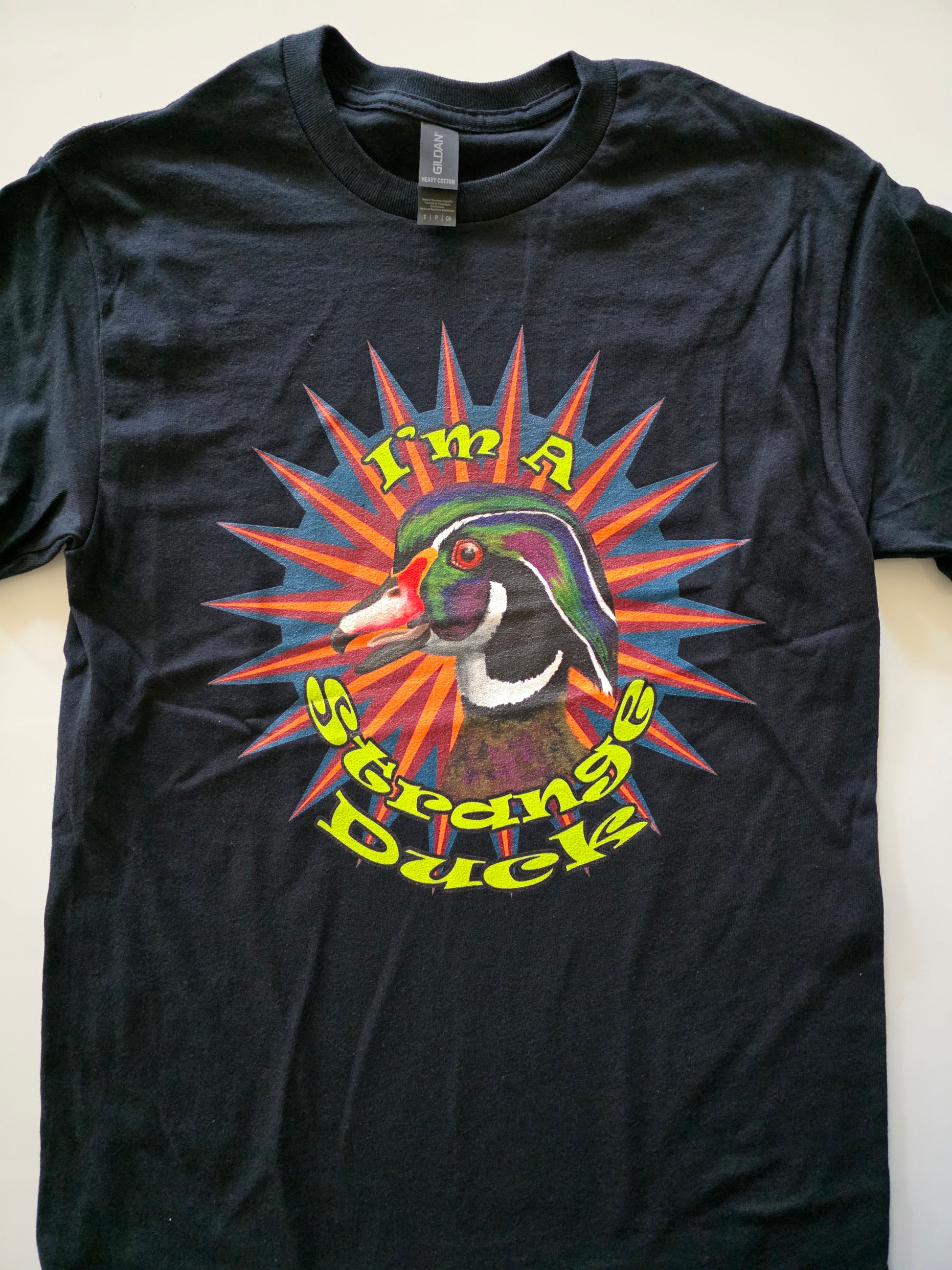 This listing is for a black t-shirt with the Strange Duck graphic, as seen in the photos. All t-shirts are 100% cotton.