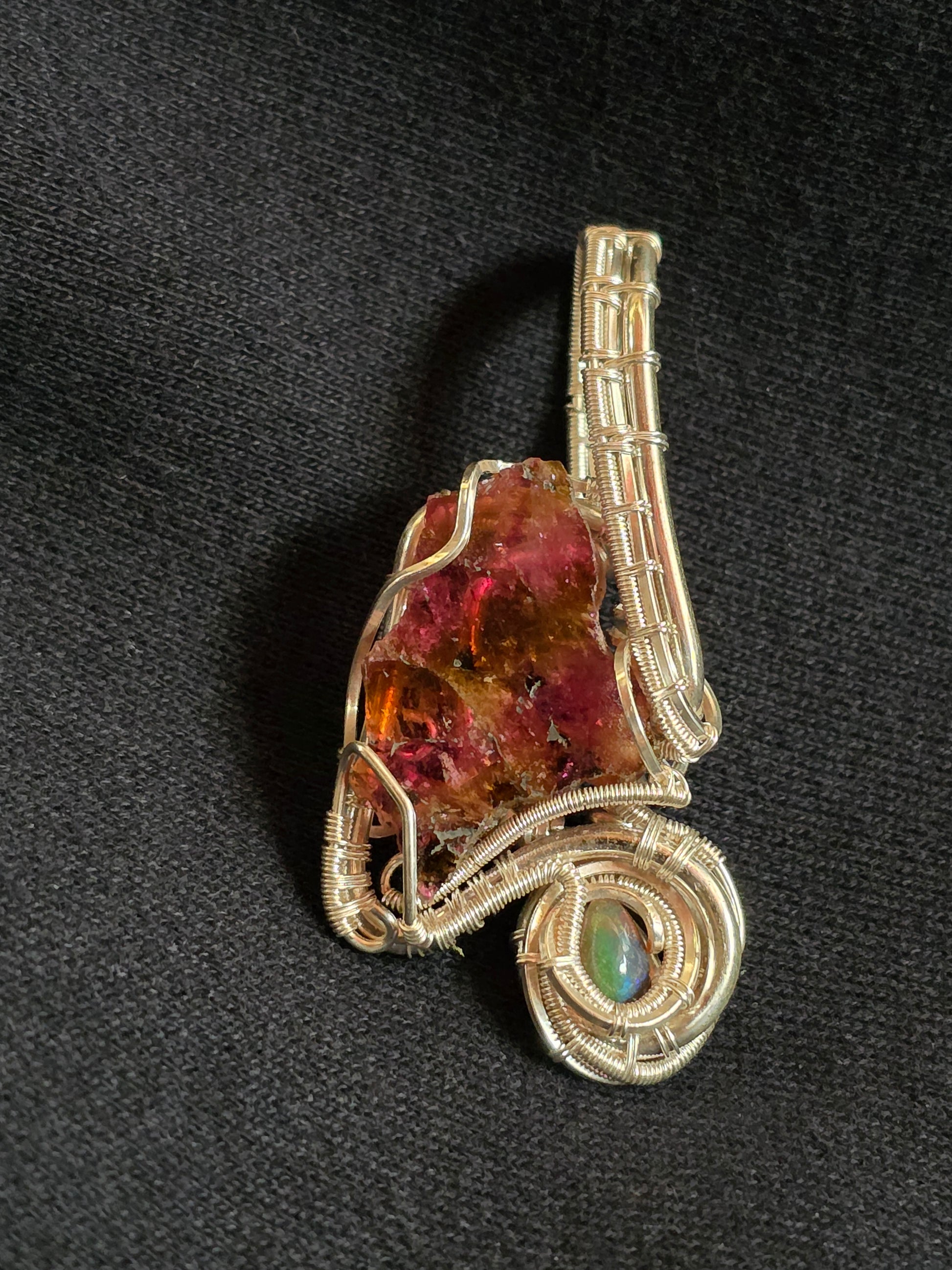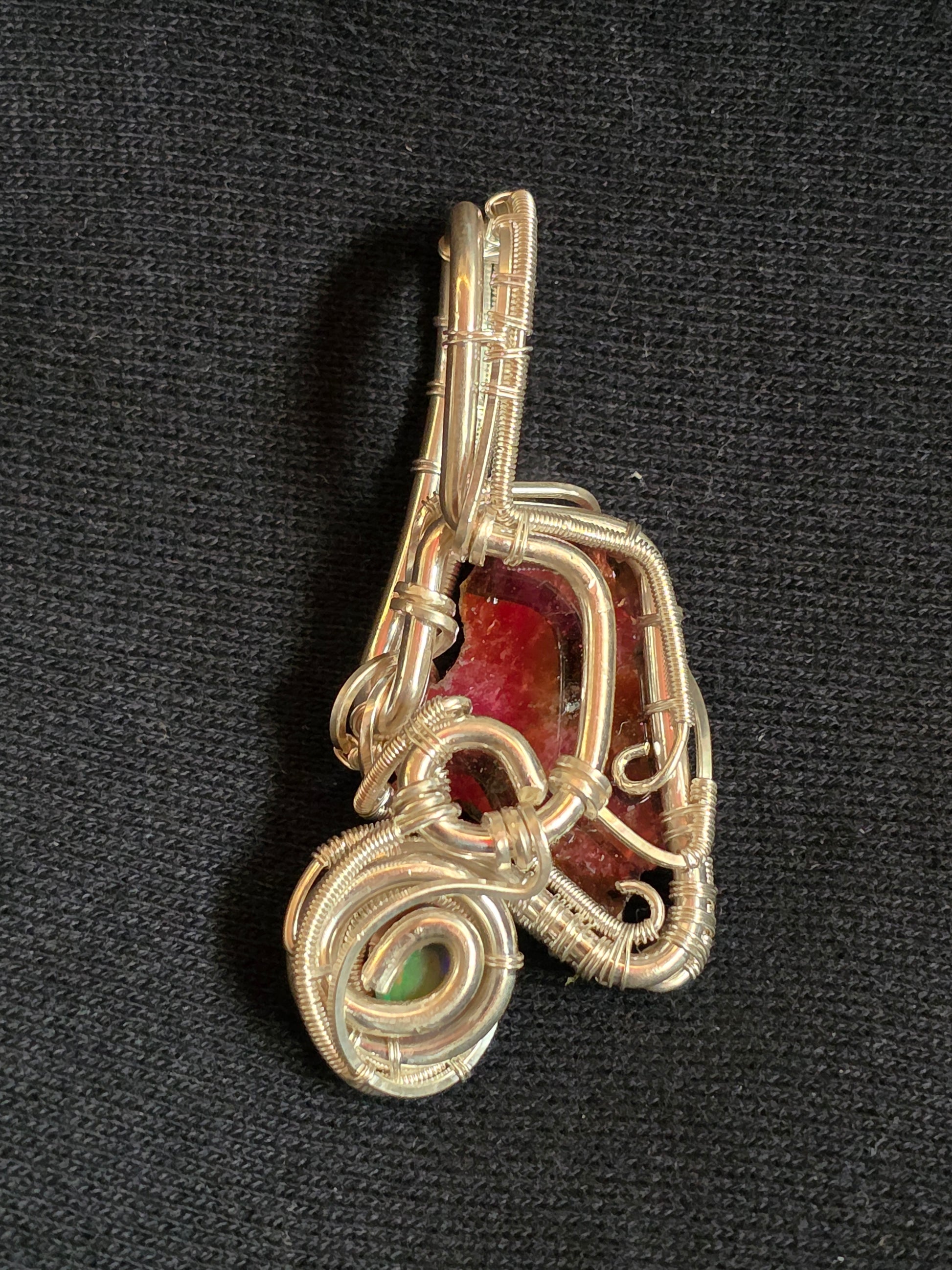 When I first saw this bi-color tourmaline slice, I immediately saw the state of Maine in its shape! So of course, being my home state, I had to have it! Wrapped in a way that protects the edges of the crystal slice while offering maximum light passage, The Maine Drip shows a beautiful compliment of purple and ochre. Then, by its namesake, a tear drop shaped Ethiopian opal offers the drip off the Maine coast. All wire used is sterling and/or fine silver.